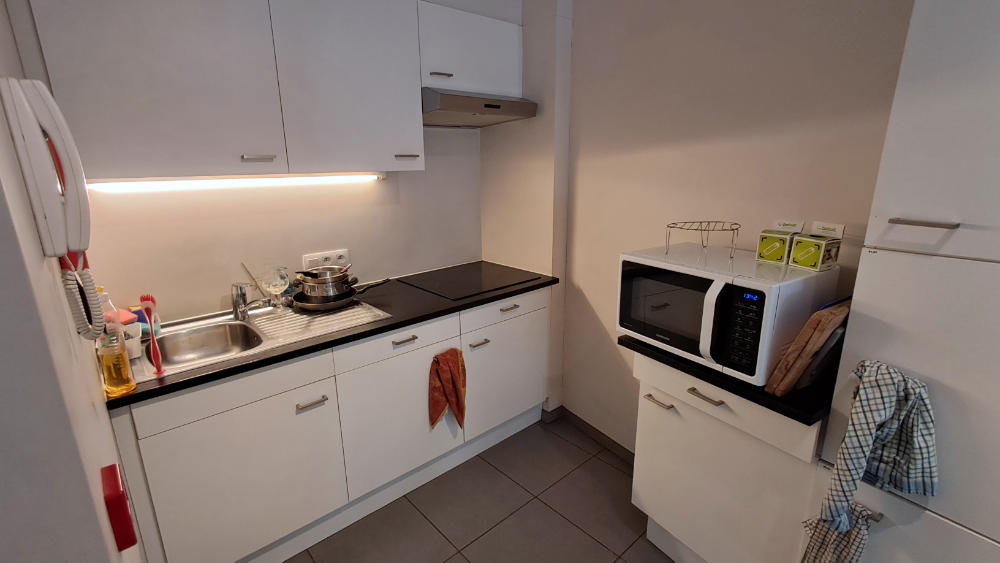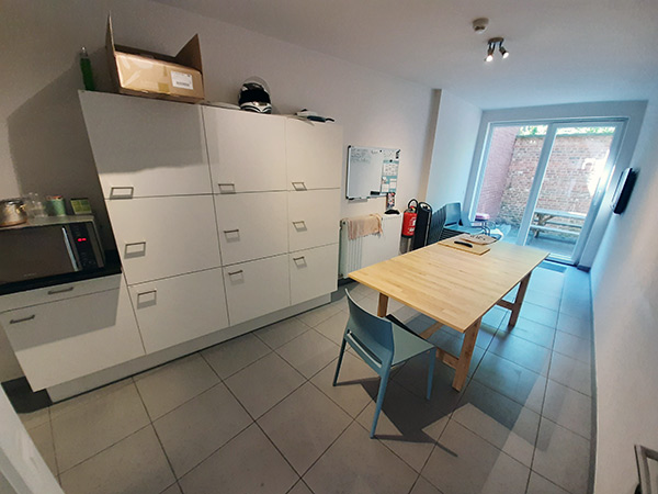 Op het gelijkvloers is een grote gemeenschappelijke keuken met vitrokeramische kookplaat en dampkap met luchtafvoer naar buiten, en 2 gemeenschappelijke ijskasten met elk een diepvriesvak. Iedere student krijgt een opbergkastje voor keukenspullen. De keuken heeft ook een zithoek met televisie. De keuken geeft uit op een koertje met picknicktafel, zodat je op zonnige dagen buiten kan eten of studeren! Je fiets kan je veilig stallen in het fietsenrek in de inkomhal.